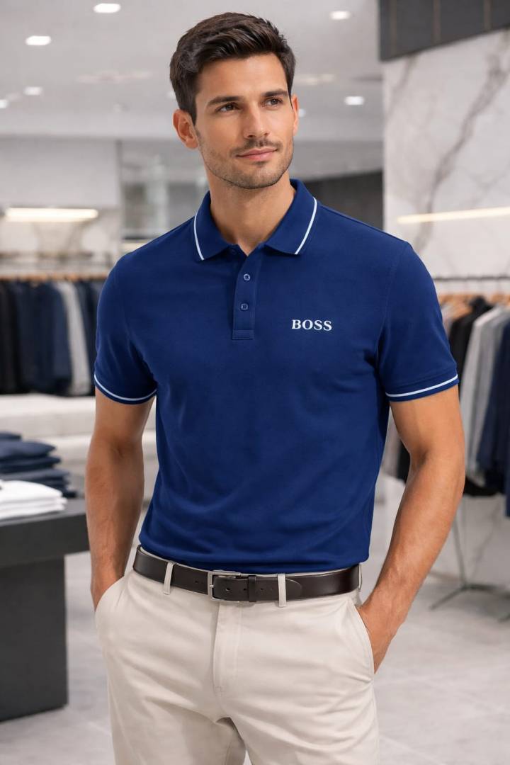 Hugo Bos s Blue Premium 240 gsm interlock compact cotton fabric Polo Tshirt with Collar Design and Emboss Logo 3747