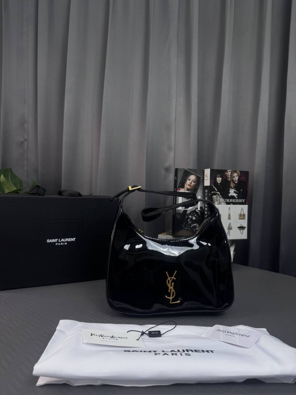 YSL SAINT LAUREINT GLOSSY BLACK HOBO SHOULDER BAG WITH DUST BAG & OG MAGNETIC BRAND BOX HEAVY QUALITY - G68PU