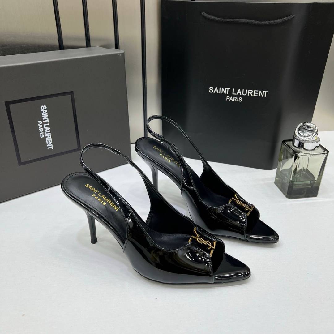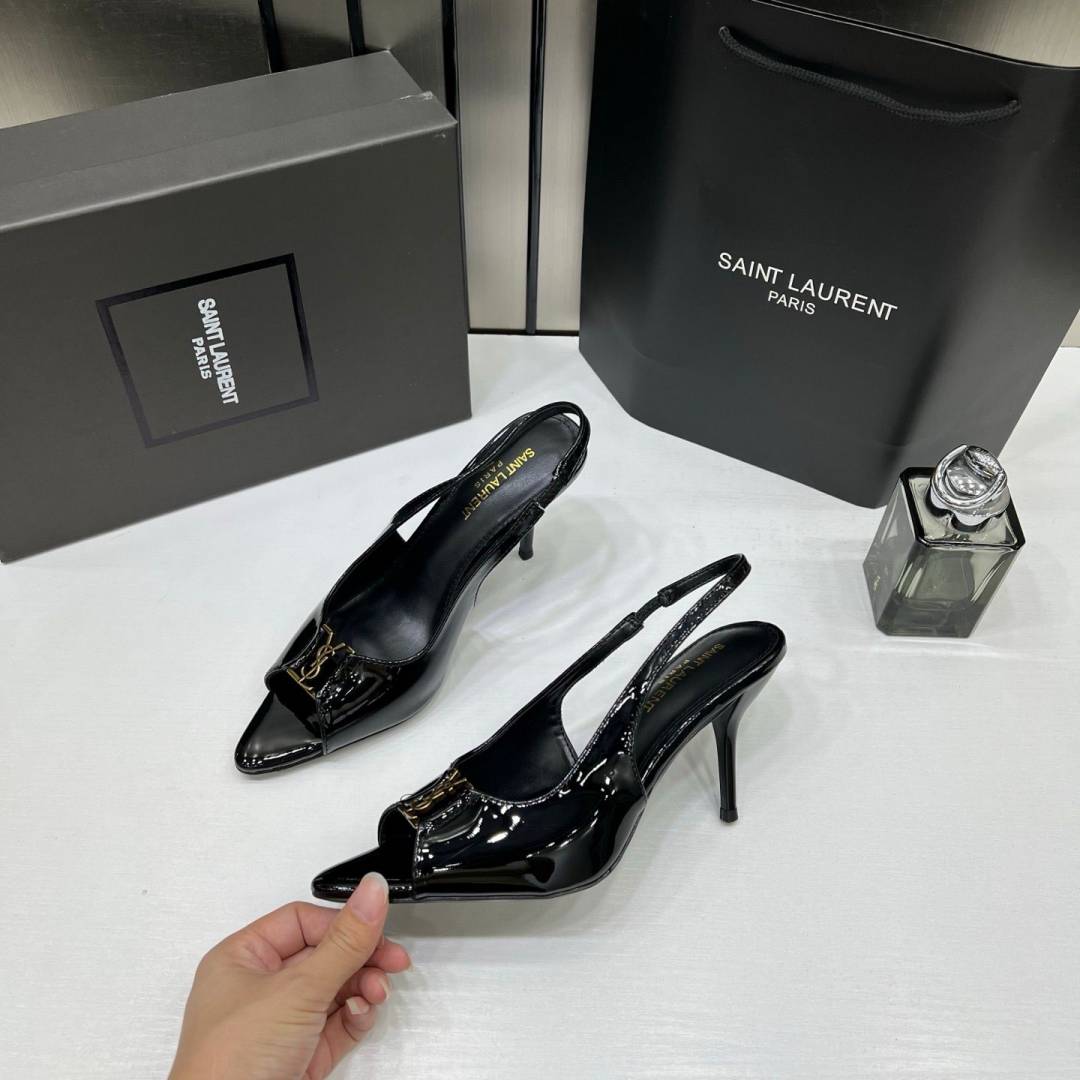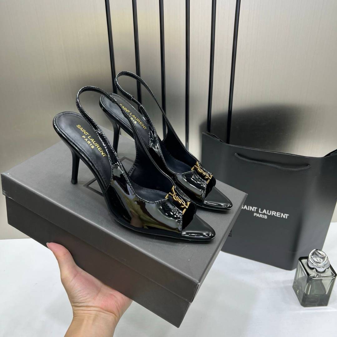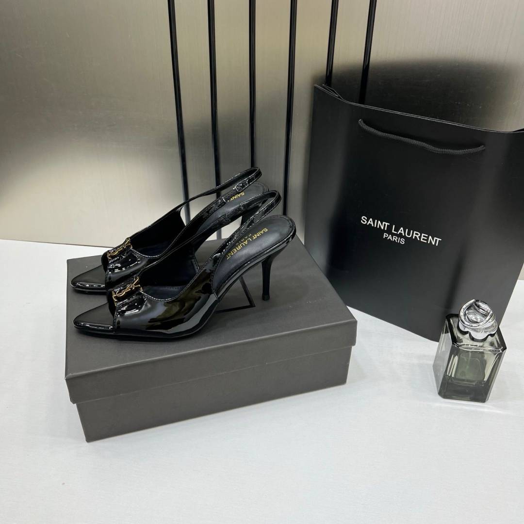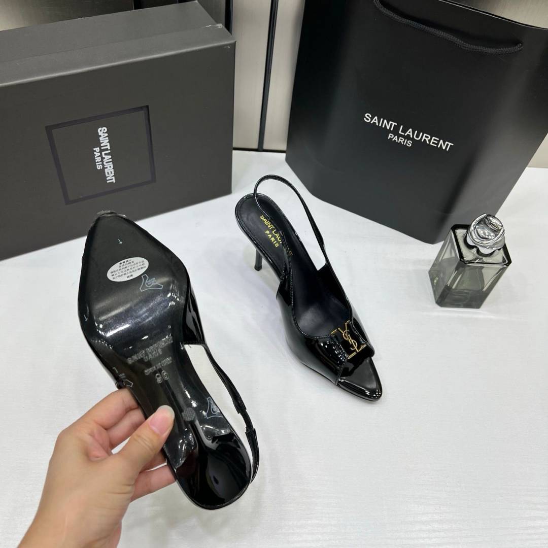 Ysl Saint Laurent Black Patent Leather Slingback Heels With OG Box & Carry Bag Black A19